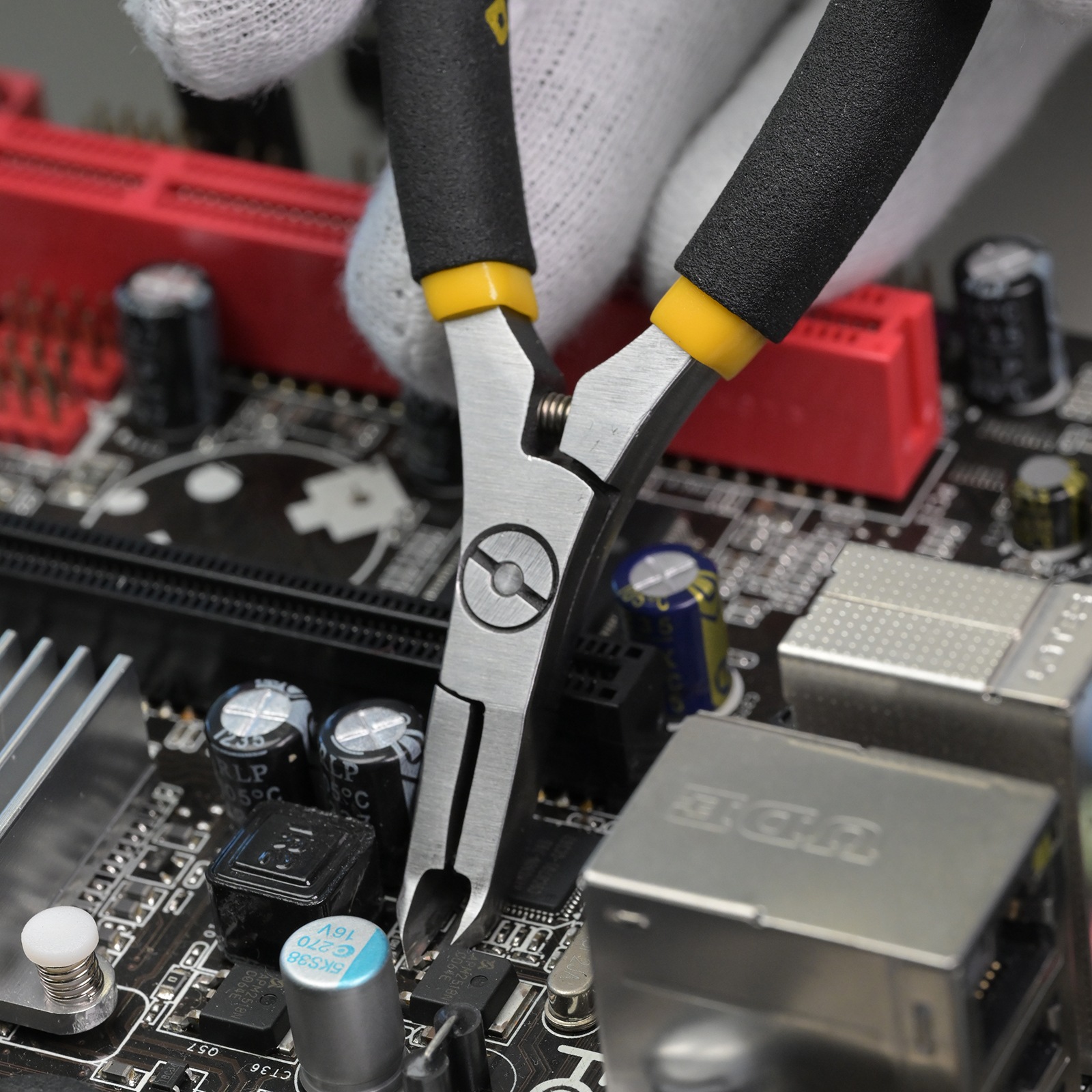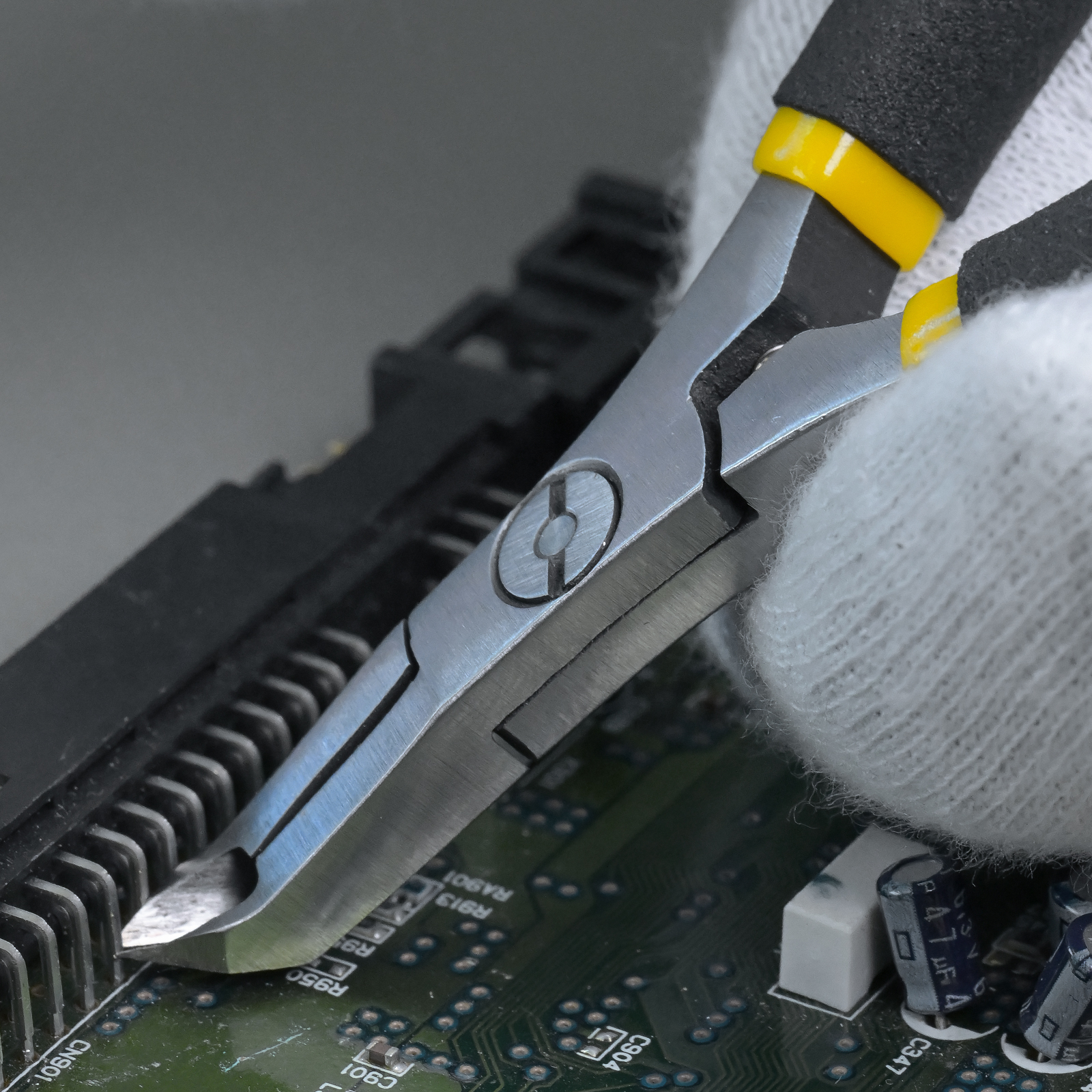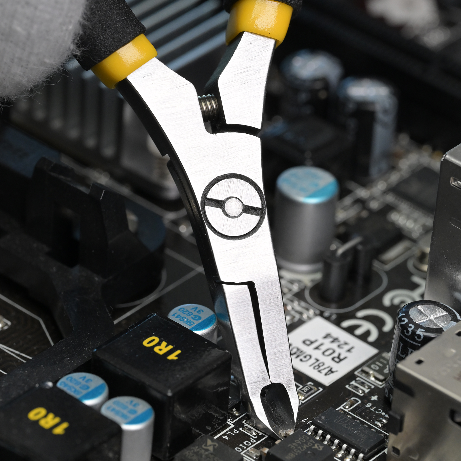 • Der Micro-Schrägvornschneider mit 8 mm Kopfbreite ist die ideale Lösung für präzise Schneidarbeiten in Elektronik, Modellbau und Feinmechanik. Dank seines extrem schlanken Kopfes erreicht er auch schwer zugängliche Stellen mühelos und ermöglicht einen absolut sauberen, bündigen Schnitt. Die Schneiden sind aus hochwertigem Carbonstahl gefertigt und garantieren eine lange Lebensdauer sowie höchste Schnittqualität. Die matt polierte Oberfläche verhindert störende Lichtreflexe, während die ergonomischen, rutschfesten Griffe für komfortables und sicheres Arbeiten sorgen. Zusätzlich ist der Seitenschneider ESD-sicher und schützt empfindliche elektronische Bauteile vor statischer Aufladung. Mit einer Schneidleistung bis Ø 1,0 mm (Kupferdraht) ist er perfekt für alle Anwendungen in der Elektronikfertigung, Leiterplattenbestückung, im Modellbau und in Laboren geeignet.